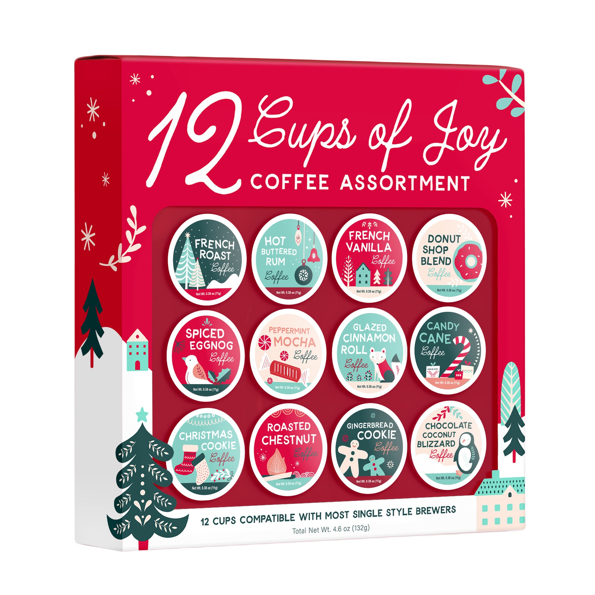 <span style="color: rgb(27, 12, 49); font-family: noto-sans, "Noto Sans", Helvetica, Arial, sans-serif;">Celebrate the holidays with a delicious treat with the 12 Cups of Joy Christmas gift pack of 12 different single serve coffee capsules. This gift set includes 12 different seasonal coffee flavor pods including French Roast, Hot Buttered Rum, French Vanilla, Donut Shop Blend, Spiced Eggnog, Peppermint Mocha, Glazed Cinnamon Roll, Candy Cane, Christmas Cookie, Roasted Chestnut, Gingerbread Cookie, and Chocolate Coconut Blizzard. Try a new flavor every day for twelve days straight. Each capsule makes a full cup of coffee. Total weight of the coffee is 4.2 oz (119g) and the packaging measures 2" x 10.7" x 10.7. Compatible with most standard single style capsule cup brewers.</span>