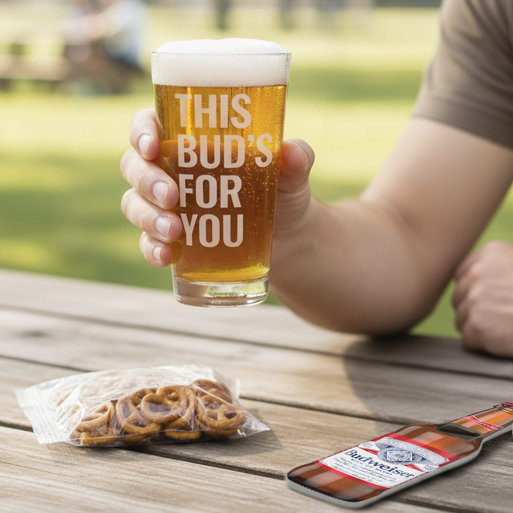 Make any Budweiser drinker feel loved with the gift of this pint glass gift set. It includes a Budweiser pint glass, a Budweiser bottle opener in the shape of a bottle, and a bag of pretzels for when they get hungry drinking an ice cold Bud. Budweiser not included. The pint glass on one side has the Budweiser King of Beers logo and on the other side says "This Bud's for You." Gift set stands about 10.5" tall and comes wrapped in a Budweiser bow. Includes a gift tag that says Budweiser Father's Day Pint Glass.