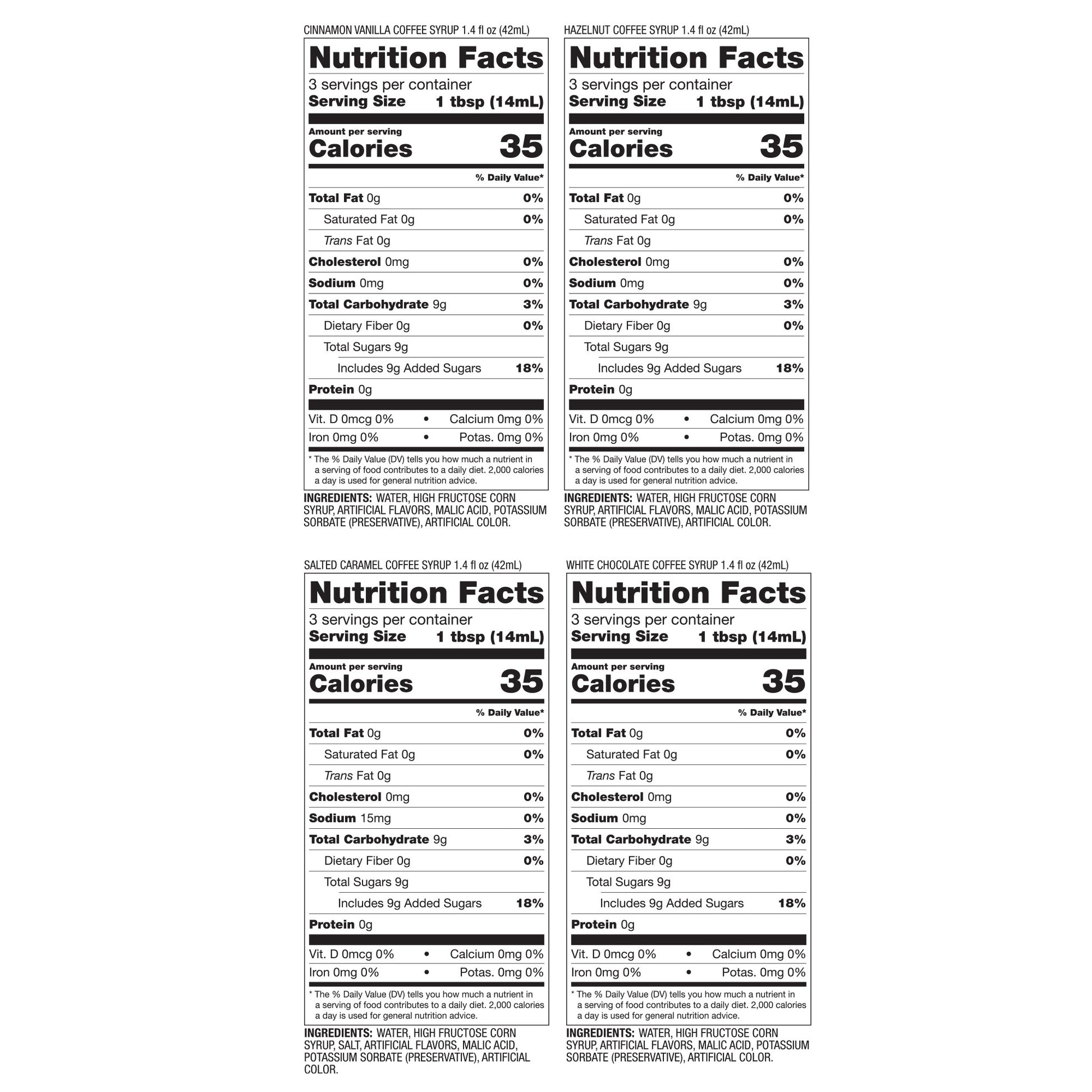 • Includes four different flavors of 1.3 Fl oz coffee syrup; Cinnamon Vanilla, Salted Caramel, White Chocolate, and Hazelnut