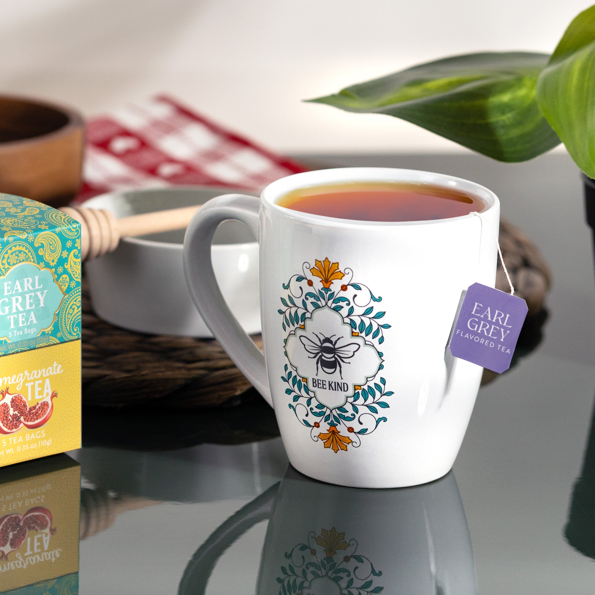 Give someone special the gift of a delicious cup of tea with the It's Tea Time gourmet tea kit by Fashion Street Cafe. The gift set includes a ceramic mug with the sentiment "Bee Kind" on it and a picture of a bee, a wood honey dipper, and two boxed varieties of black tea. The tea varieties are Earl Grey and Pomegranate and each tea box contains contains 5 tea bags (10 tea bags total). Overall packaging measures 9.3" x 3.8" x 6.5".