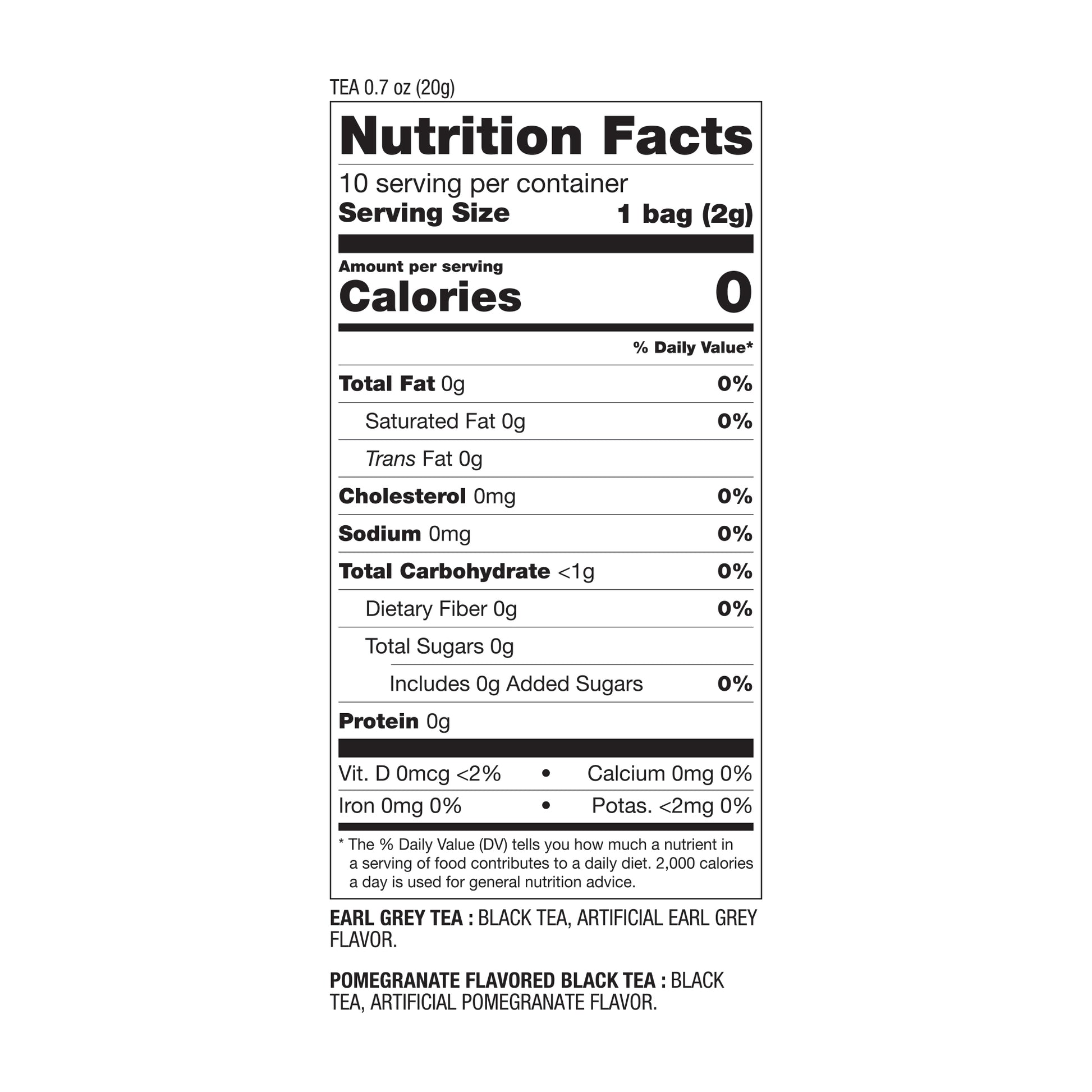 • Tea varieties are Earl Grey and Pomegranate and each tea box contains contains 5 tea bags (10 tea bags total)